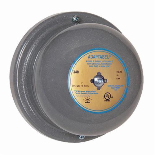 Edwards Signaling Vibrating Bell, Series: 340, 120 VAC, 0.062 A, 7.4 VA Power, 60 Hz Frequency, 98/88 dB Sound Level, Specifications Met: UL Listed, FM Approved, 4 in Gong, Surface Mounting, Die Cast, Gray, 4-1/2 in Dia x 2-13/32 in D Dimensions